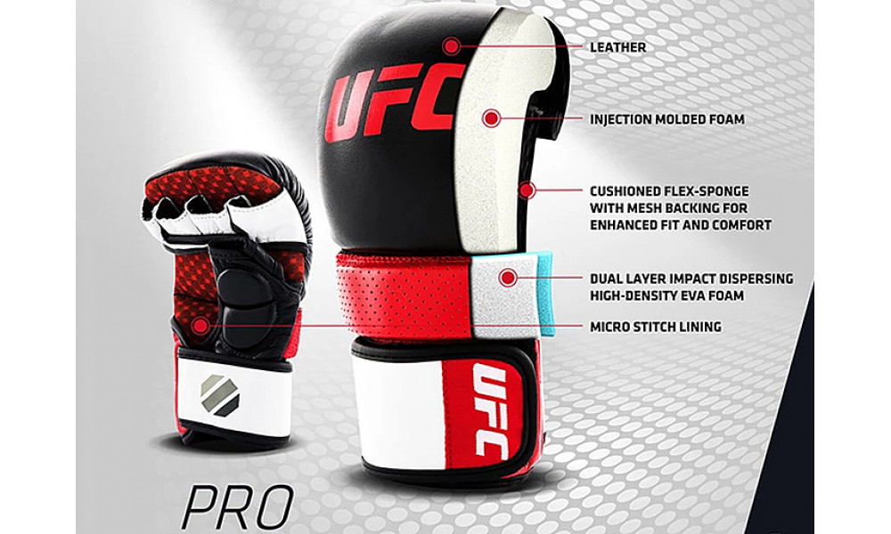 Перчатки для спарринга UFC Pro имеют изогнутую форму, которая рассеивает ударную нагрузку, не влияя на подвижность руки. Поверхность перчаток выполнена из прочной перфорированной кожи.