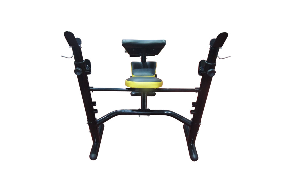 Прочная устойчивая конструкция с ударопрочным эмалевым покрытием. Стойки под штангу с замками безопасности. Жим лежа, сгибание и разгибание ног в коленном суставе, парта для бицепсов. Рычаги блока для ног снабжены мягкими валиками.